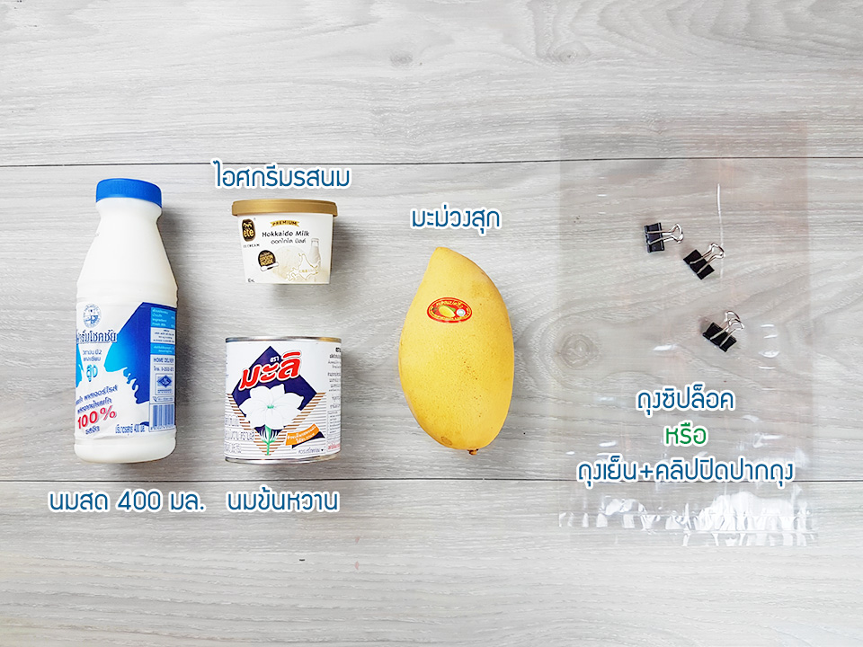 4) มะม่วงสุก 1 ลูก - โชคดีมากที่ฤดูร้อนเป็นหน้ามะม่วงพอดี ดังนั้นจะหาซื้อได้โดยทั่วไปและถูกมากด้วย แต่ถ้าจะใช้อย่างอื่นก็ได้โดยผลไม้ที่เหมาะสมจะเป็นผลไม้ที่ (1) นิ่ม (2) หวานหรือเปรี้ยว เช่น ส้ม Dole หรือผลเบอร์รี่ต่างๆ แต่สำหรับบล็อกนี้จะใช้มะม่วงสุกละกันเพราะคนน่าจะชอบเยอะ