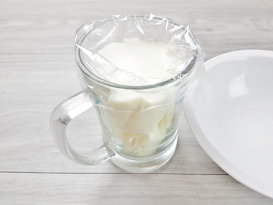 19) เทเกล็ดนมแข็งที่ได้ลงในถ้วยให้เรียบร้อย พร้อมตบๆให้โค้งๆเป็นกลมๆ