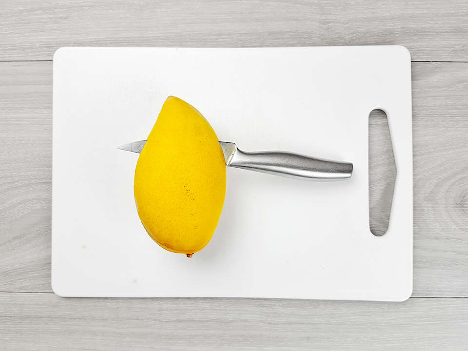 13) ระหว่างนี้เตรียมมะม่วงกัน! เราจะทำมะม่วงให้เป็นชิ้นๆลูกเต๋ากัน เริ่มต้นด้วยการผ่ามะม่วงแบบไม่ต้องปอกเปลือกตามแนวเม็ดทั้งสองฝั่ง แล้วก็โยนเม็ดทิ้งไป