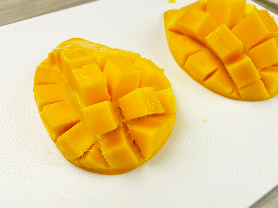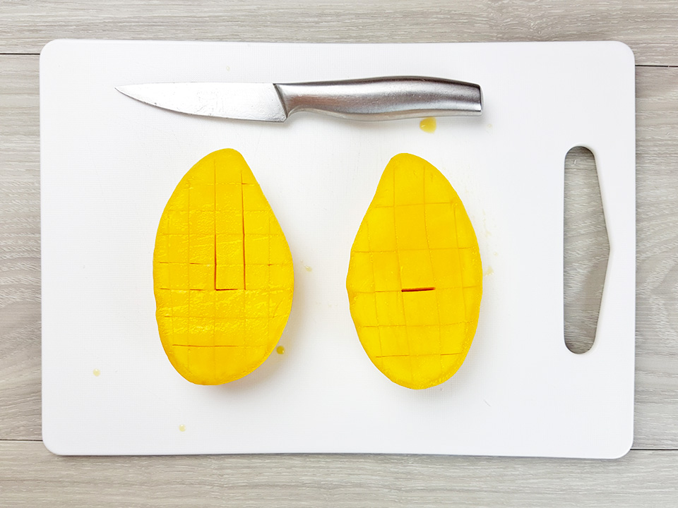 14) หั่นเนื้อมะม่วงเป็นตารางแต่ไม่ต้องให้ทะลุเปลือก อยากได้ขนาดไหนก็แล้วแต่เลยครับ ถ้าให้แนะนำก็ราวๆ 2 ซม. x 2 ซม. กำลังดี