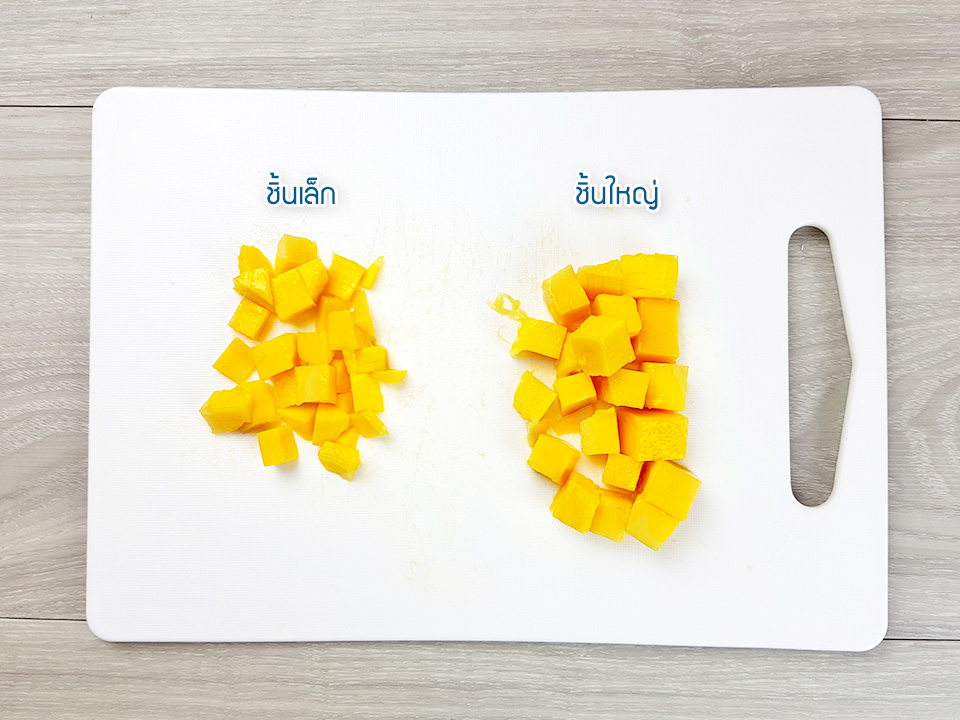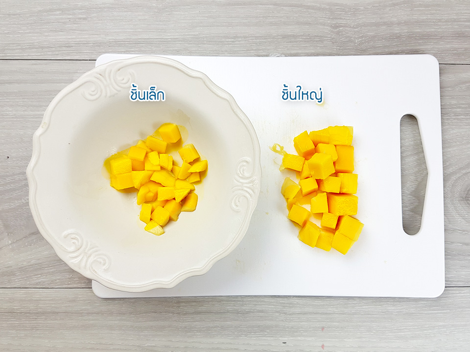 16) ใช้มืดฝานออกมาทีละแถวจะได้มะม่วงออกมาเป็นชิ้นเล็กๆสวยงาม แยกชิ้นเล็กและชิ้นใหญ่ออกจากกัน