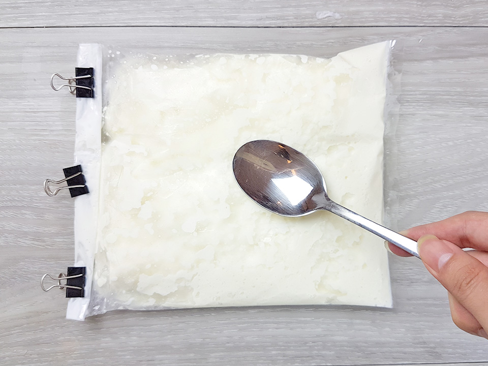 11) เช็คถุงนมดูว่าตอนนี้แข็งเรียบร้อยแล้วหรือยัง หากแข็งแล้วให้เอาออกมาแล้วใช้ช้อนกดๆๆๆๆๆสับๆๆๆๆเพื่อให้มันแตกตัวเป็นเกล็ดละเอียด