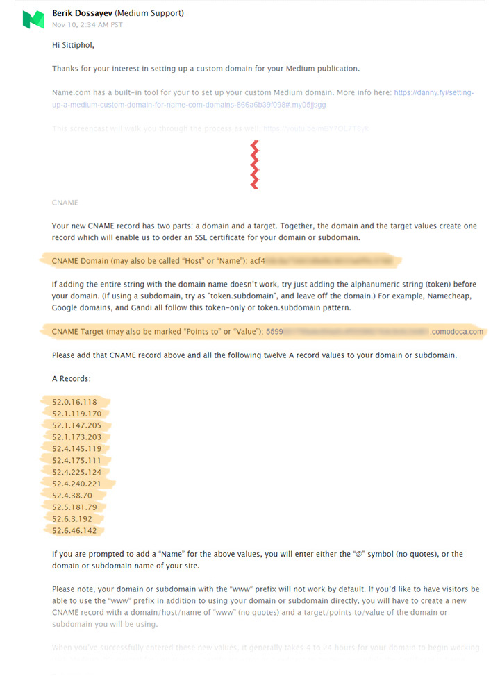 แล้วก็กด Submit ครับ จากนั้นก็ ... "รอ" ครับ ภายใน 3 วัน Medium จะส่งพวกข้อมูล DNS Record ที่ต้องใช้กลับมาทางอีเมล ระหว่างนี้ก็เขียนบล็อกสะสมไปพลางๆก่อน ตอนโดเมนขึ้นเว็บจิได้ไม่เหงา หรือถ้ามีบล็อกที่เขียนไว้ในโปรไฟล์ส่วนตัวก็ใช้ช่วงนี้แหละนั่งจิ้มบทความที่มีอยู่แล้วขึ้น Publication ให้เรียบร้อย ฮึบๆๆๆ