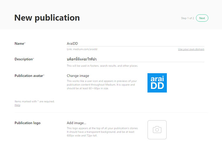 ถึงตัวอย่างนี้จะใช้ชื่อ Publication (ก็คือ AraiDD) แต่ในกรณีของท่าน ท่านกำลังจะทำ Publication ส่วนตัว ดังนั้นสามารถใช้ชื่อตัวเองได้เลยนะครับ ไม่ต้องกังวล (NuuNeoI งี้) เช่นเดียวกันกับ Avatar เอาที่เหมาะสมได้เลย