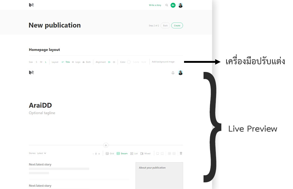 ในหน้า New Publication ให้ใส่ ชื่อของ Publication, Description และ รูป Avatar ลงไป ซึ่งชื่อของ Publication จะส่งผลต่อ URL บน Medium ด้วย และหลังจากผ่านขั้นตอนนี้ไป เราจะไม่สามารถเปลี่ยน URL นี้ได้อีก อย่างไรก็ตามมันอาจจะไม่ใช่ประเด็นสำหรับบทความนี้เท่าไหร่ เพราะสุดท้ายเราจะให้ผู้ใช้เข้าผ่านโดเมนของเรา ก็คือ URL นี้เราจะไม่ได้ใช้นั่นเองครับ (แต่ทำสวยๆไว้ก็ดี เอาฤกษ์เอาชัย)