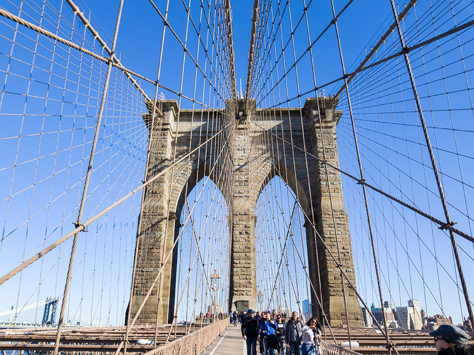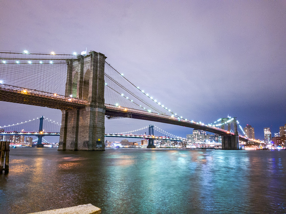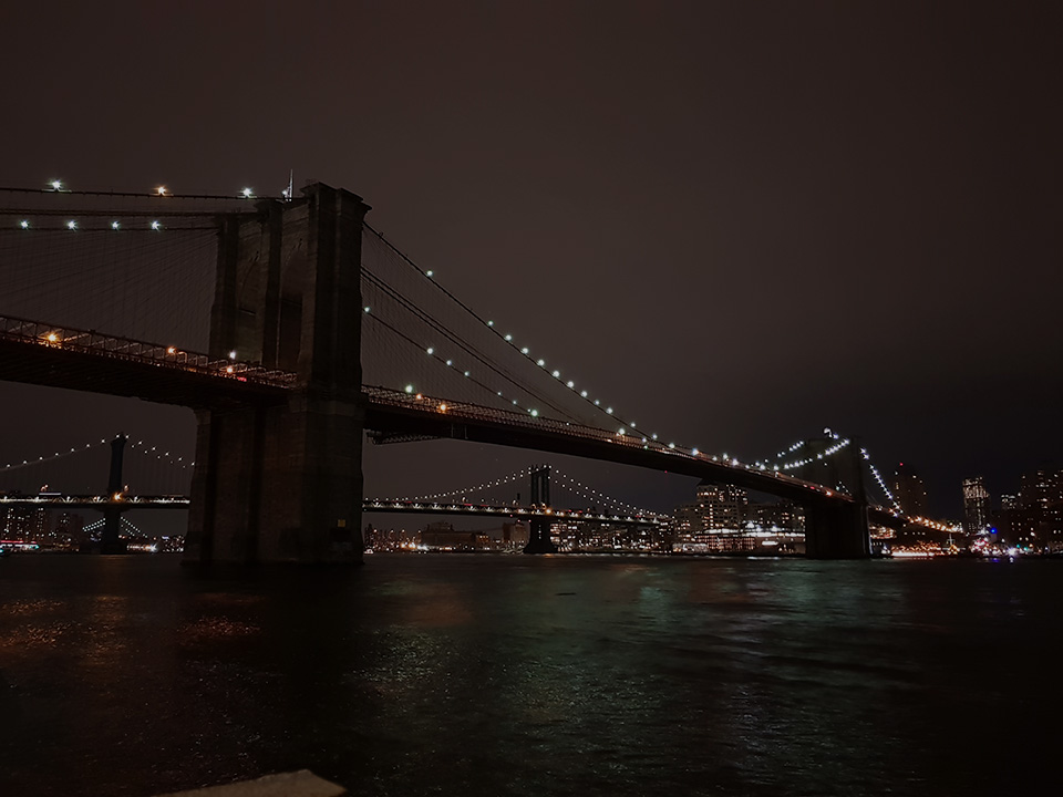 ภาพนี้เป็นภาพที่ถ่ายที่สะพานบรู๊คลินในสภาพมืดมาก มองผิวน้ำไม่เห็น มองรายละเอียดบนสะพานไม่เห็น โดยตั้งขาตั้งกล้อง ตั้งค่า ISO ไว้ที่ 50 และเปิดหน้ากล้องทิ้งไว้ 4 วินาทีจ้า