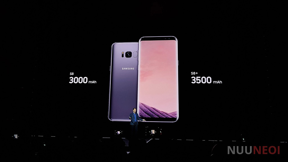 และแน่นอน ขนาดที่ต่างกันก็มาพร้อมขนาดแบตเตอรี่ที่ต่างกันด้วย โดย S8 จะมาพร้อมแบต 3000 mAh ส่วน S8+ จะมาพร้อมแบต 3500 mAh