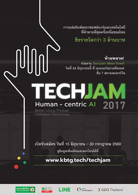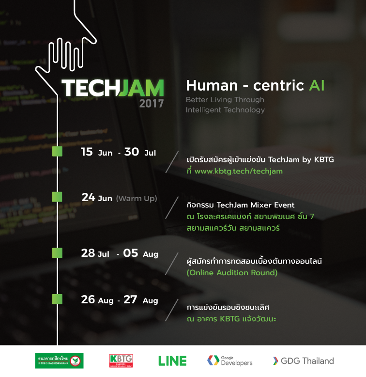 และเผอิญเมื่อวานได้รับการติดต่อมาจากทาง KBTG (KASIKORN BUSINESS TECHNOLOGY GROUP - บริษัทของธนาคารกสิกรไทยที่ทำเกี่ยวกับเรื่องนวัตกรรม) ว่ากำลังจะมีการจัดงานแข่ง Hackathon เกี่ยวกับด้าน AI ที่ชื่อว่า TechJam by KBTG พอดี แอบสนใจทันทีที่ได้ยิน เพราะอีเว้นต์แบบนี้ไม่ได้อยู่ดี ๆ อยากจะจัดก็จัด ต้องเตรียมตัวมาสักพักแล้วแน่นอน และการที่ KBTG จะจัดงานแข่งด้าน AI นั่นแปลว่าในบริษัทได้มองอนาคตมาสักพักแล้วว่า AI กำลังจะมา ยอมรับเลยว่าวิชั่นของบริษัทถือว่านำหน้าบริษัทส่วนใหญ่ในไทยมาก