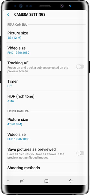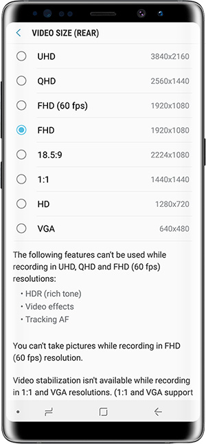 นอกจากนั้นก็ยังตั้ง Resolution ของวีดีโอได้อีกด้วย โดย Note 8 สามารถถ่ายวีดีโอได้ละเอียดสูงสุดถึง 4K ที่ 30fps นอกจากนั้นยังสามารถถ่ายวีดีโอแบบ 60fps ได้อีกด้วย แต่ได้แค่ความละเอียดเดียวคือ 1080p (FHD) ครับ