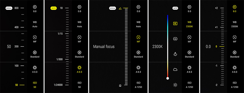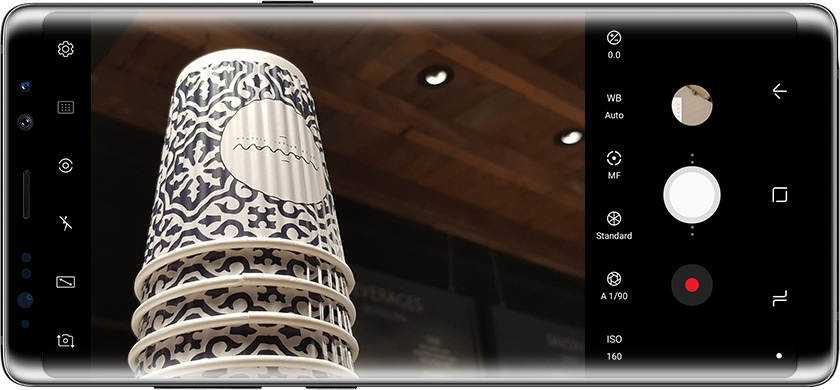 ความหล่อความเท่ของมือถือ High-End ของซัมซุงคือ สามารถควบคุมการถ่ายภาพได้เหมือนกล้องดิจิตอลแบบจริงจัง ซึ่งเราเรียกโหมดนี้ว่าโหมด Pro ครับ วิธีเข้าโหมดนี้คือปัดหน้าจอไปทางขวาแล้วเลือก Pro จะได้หน้าตา UI ที่เปลี่ยนไปเล็กน้อยแบบนี้