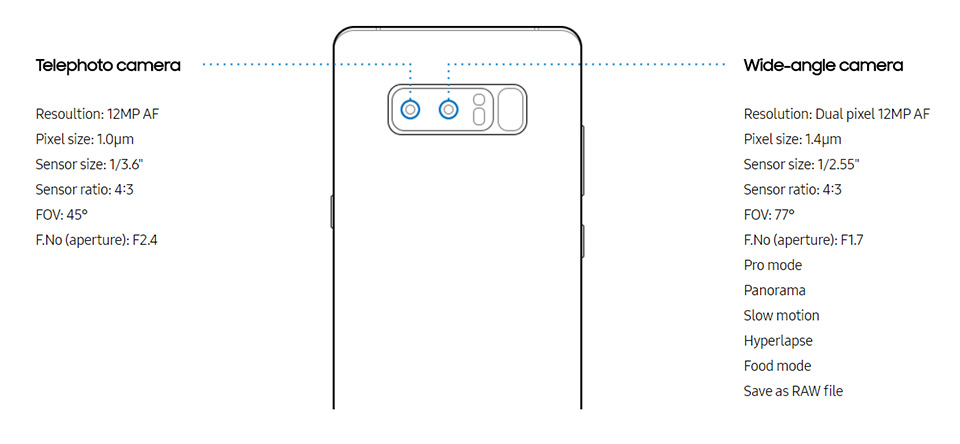 สำหรับสเปคกล้อง Wide-angle ของ Note 8 นั้นเหมือนกับกล้องหลังของ S8 และ S8 Plus ทุกประการทั้งเลนส์ โมดูลกล้องและเซนเซอร์รับแสง คือ