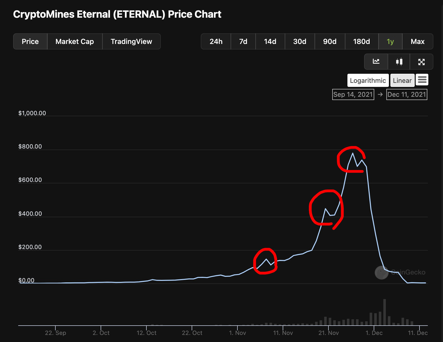 ปกติแล้วถ้าเหรียญราคาขึ้นสูงมาก ๆ ก็จะมีคน Take Profit ขายทำกำไร ทำให้เหรียญราคาลง แต่พอมันเป็นเกมนี้ ผู้เล่นไม่ได้เก็งกำไรค่าเหรียญ แต่เอาเหรียญไปเปลี่ยนเป็นอุปกรณ์เล่นเกม (ยาน) ไปหมดแล้ว แถมรางวัลที่เล่นได้ก็ต้องรอ 14 วันเพื่อให้ได้เต็มเม็ดเต็มหน่วย ด้วยเหตุผลเหล่านี้ทำให้เกิดกำลังซื้ออย่างเดียว ไม่มีแรงเทขายใด ๆ ไม่มี Supply ของ ETERNAL เพิ่ม กราฟจึงมีแต่ขึ้นนั่นเอง